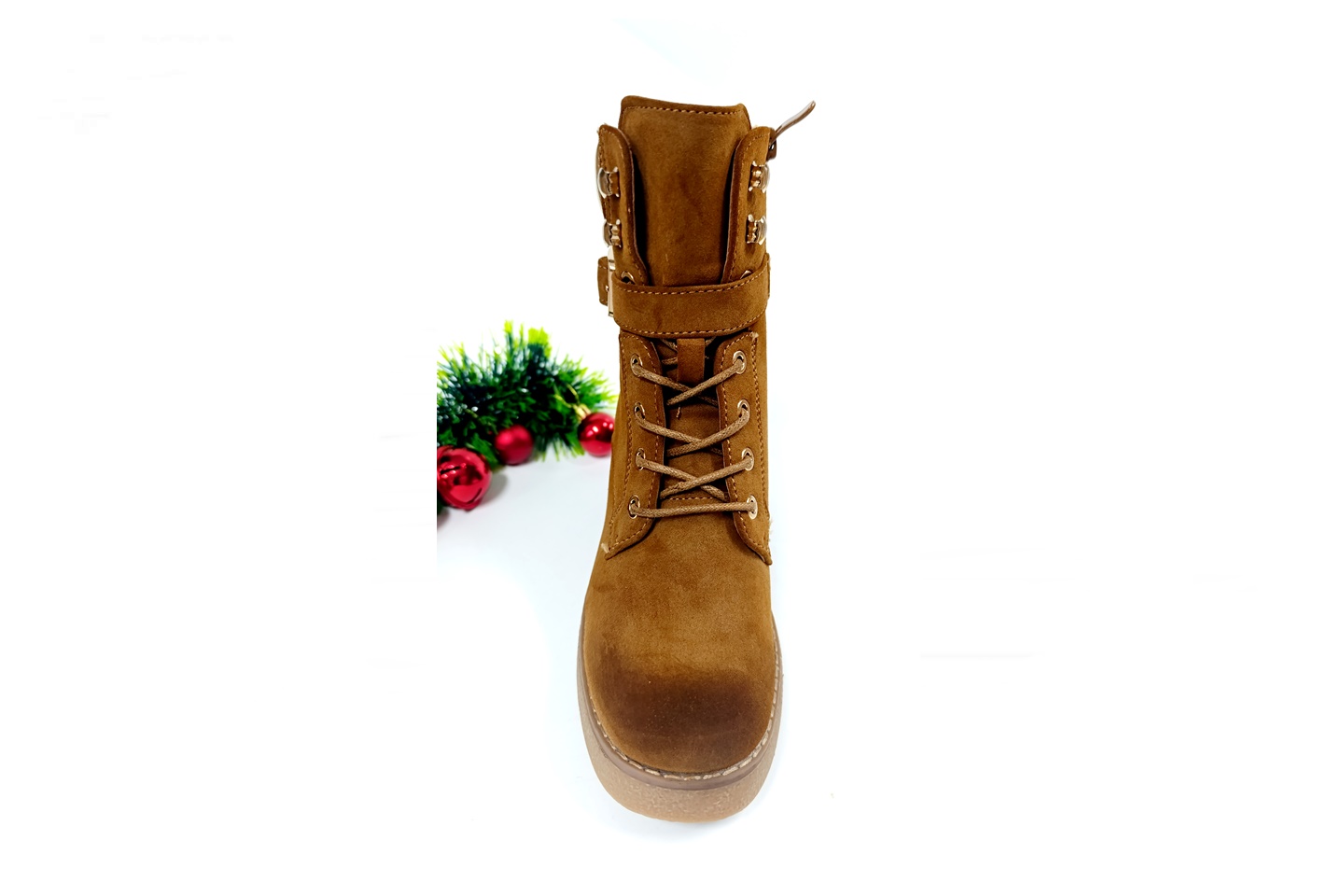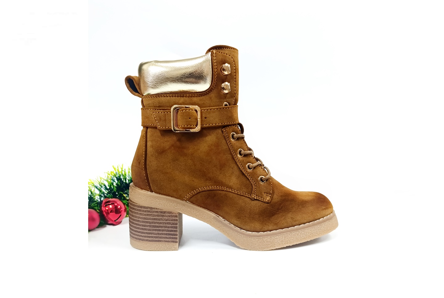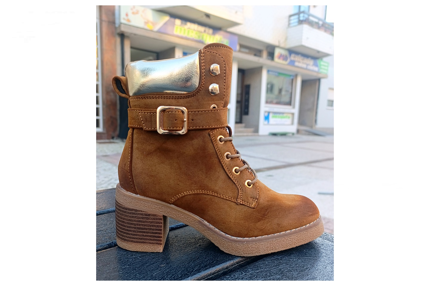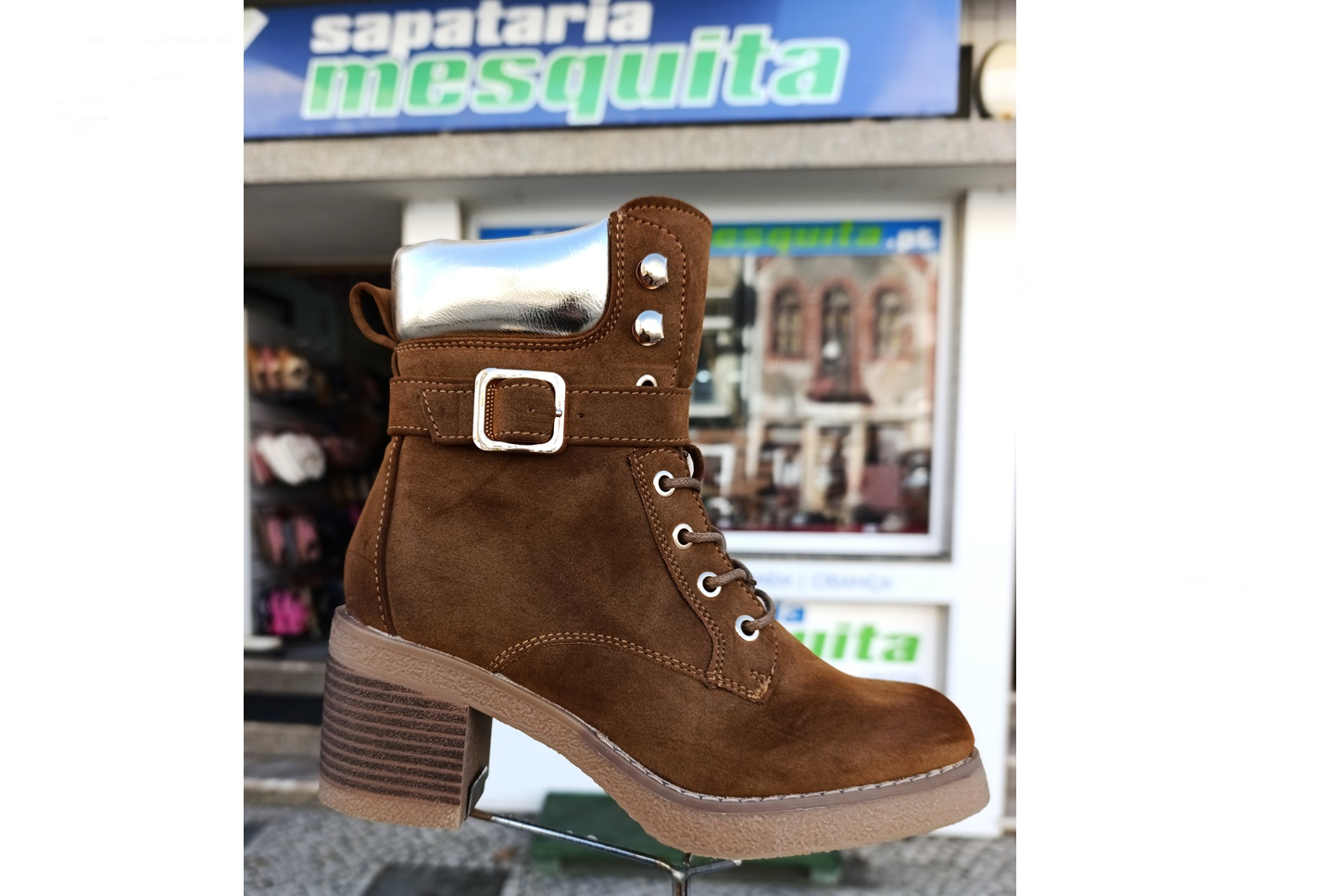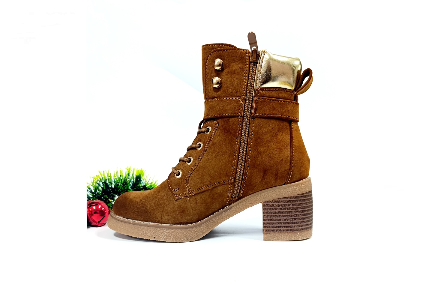 bota de senhora de tacão quadrado com atacadores e fecho preta com dourado