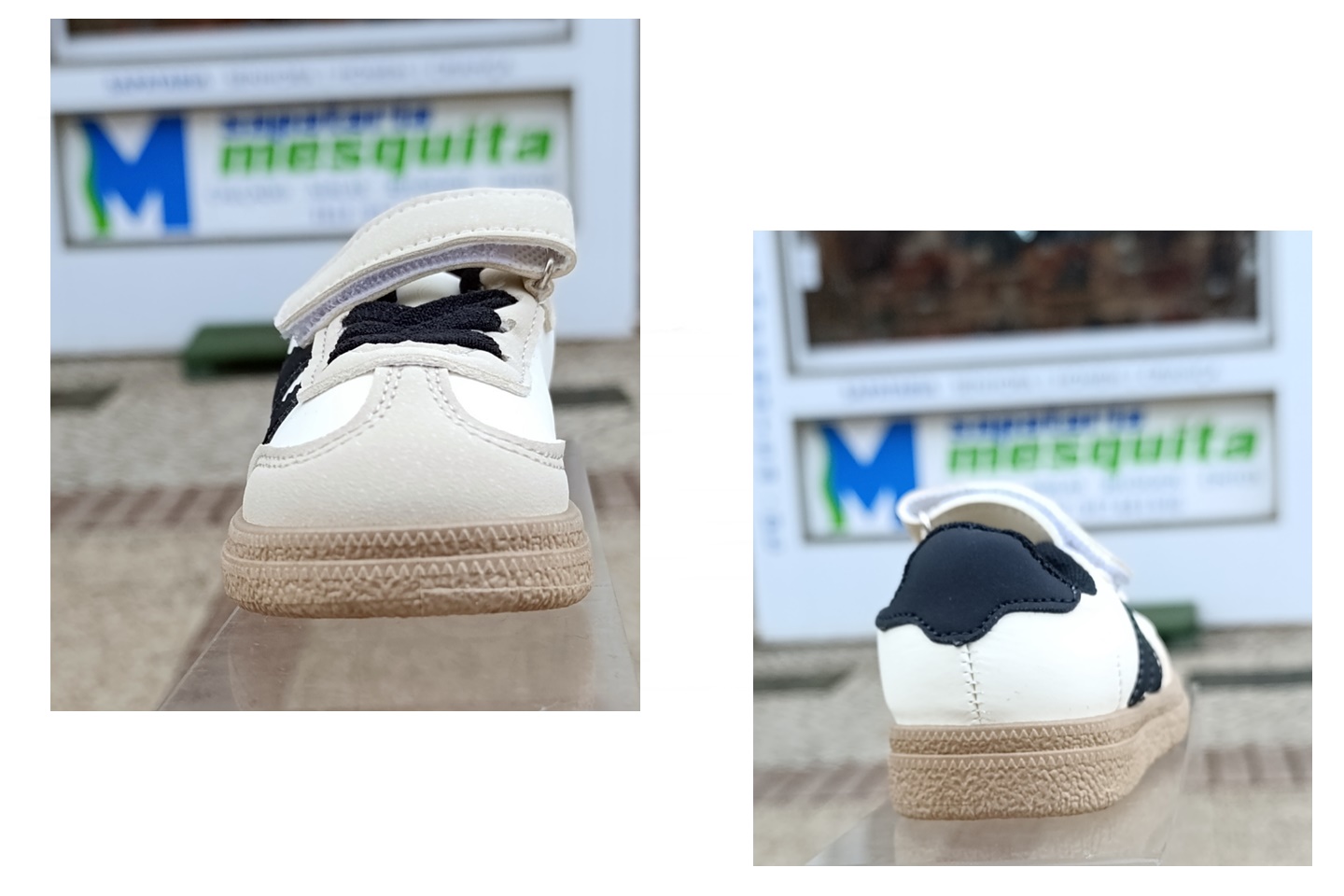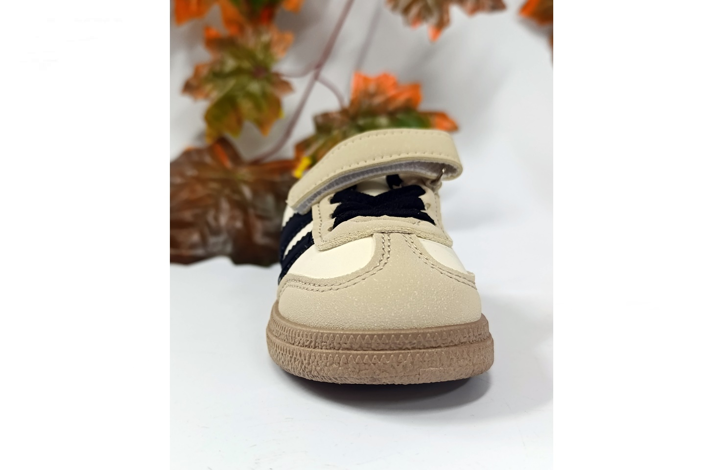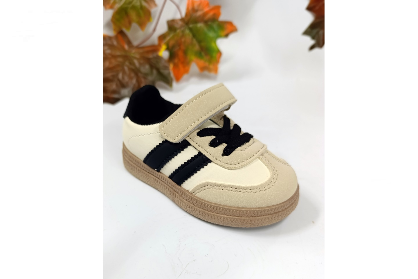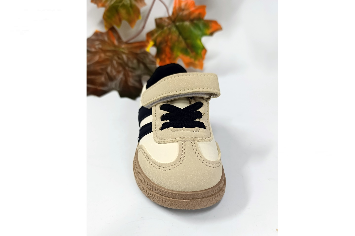 sapatilha de criança cordoes elásticos e velcro bege com riscas pretas