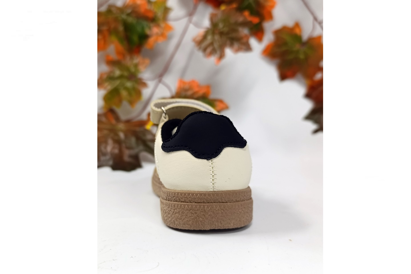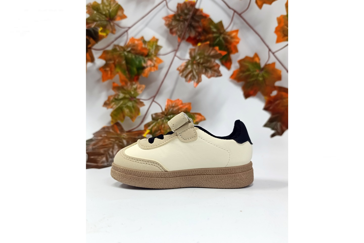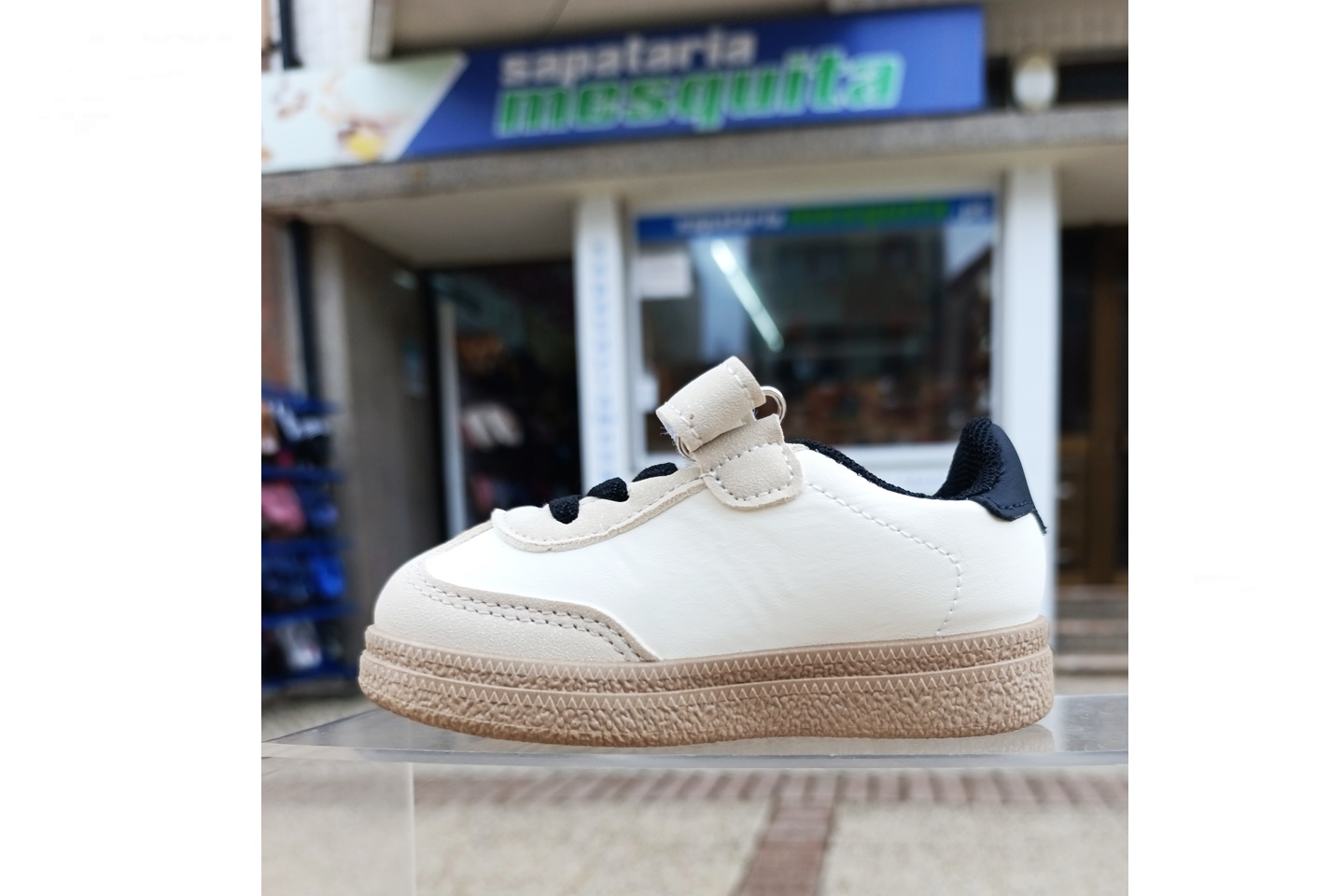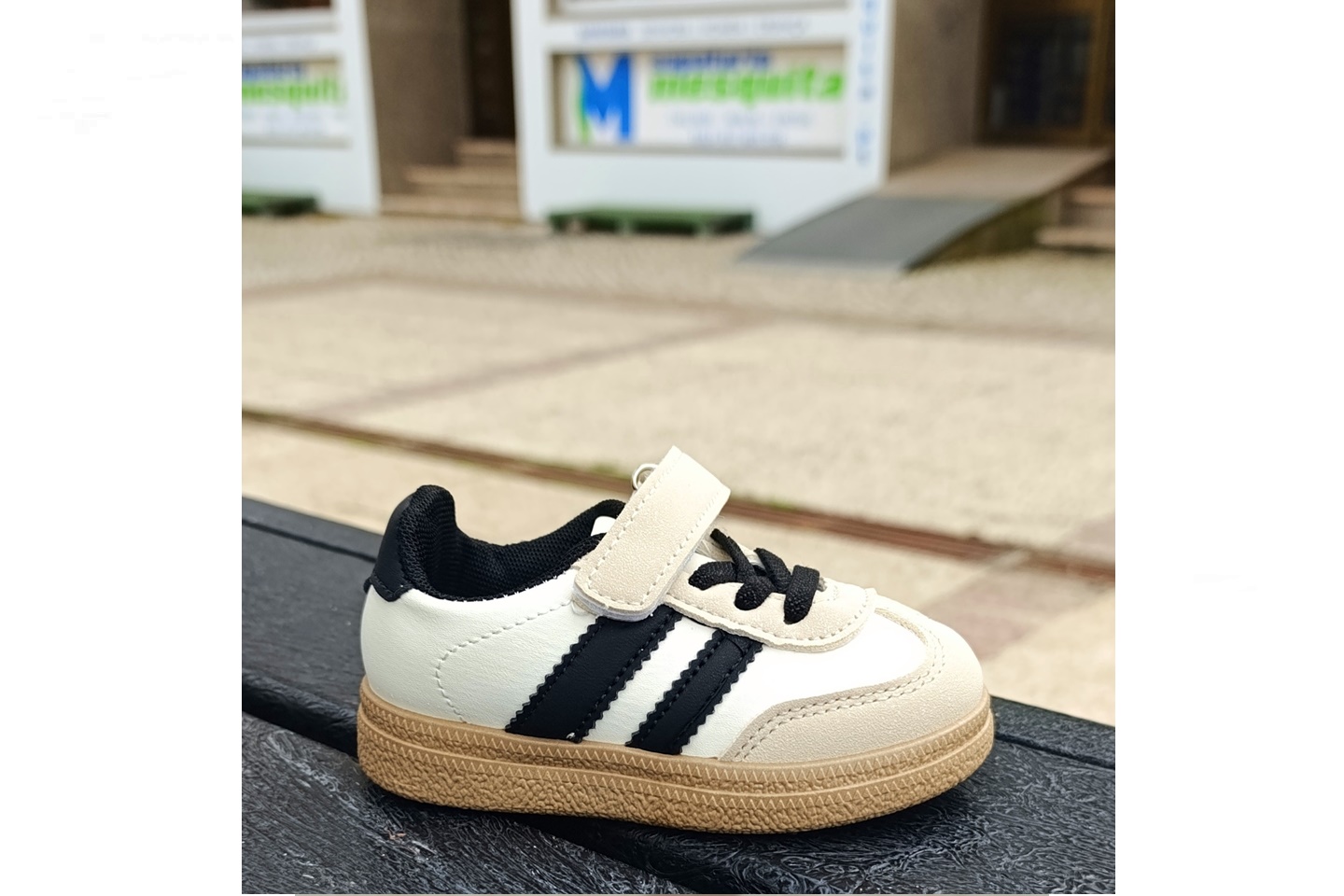 sapatilha de criança cordoes elásticos e velcro bege com riscas pretas