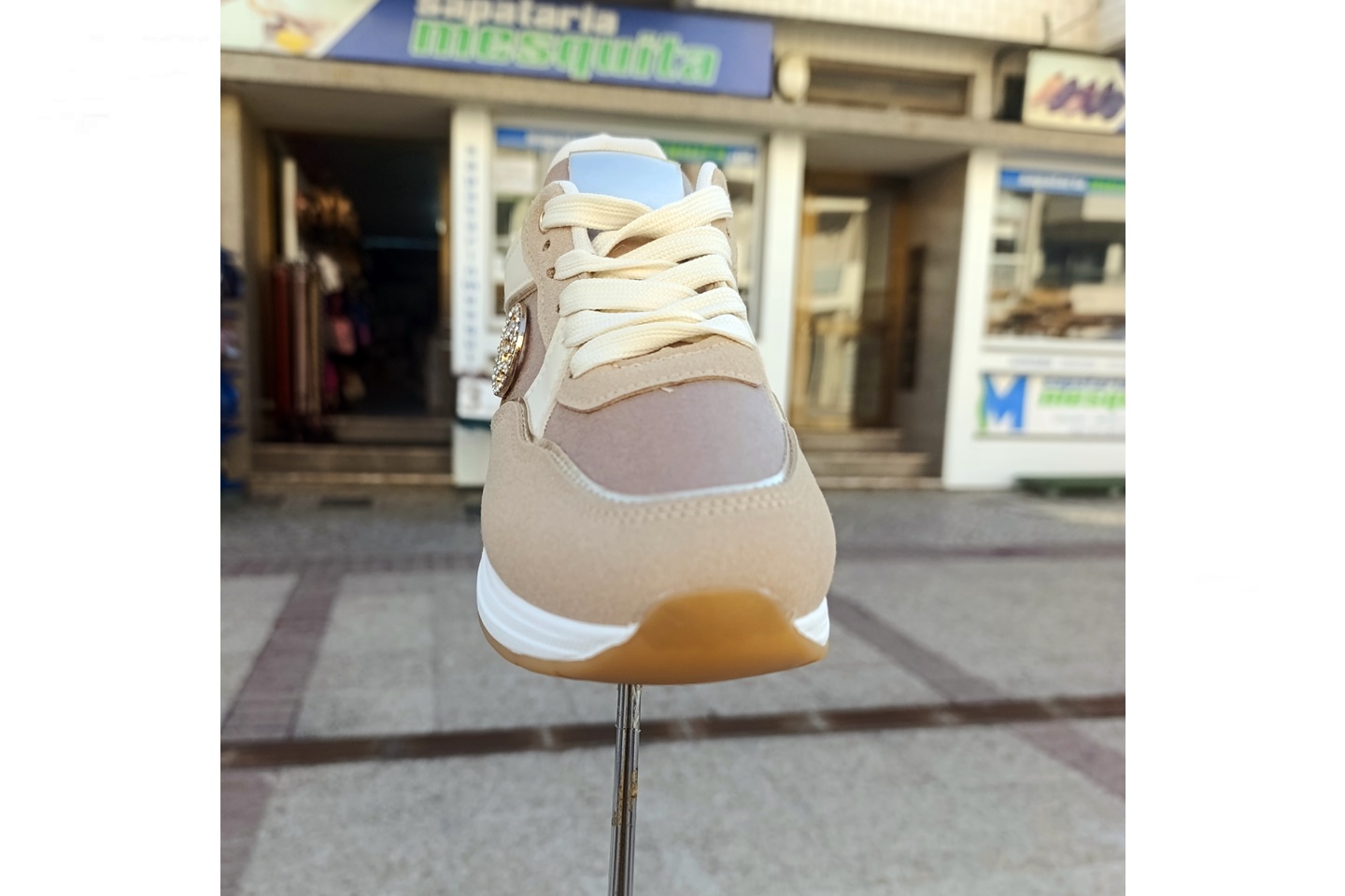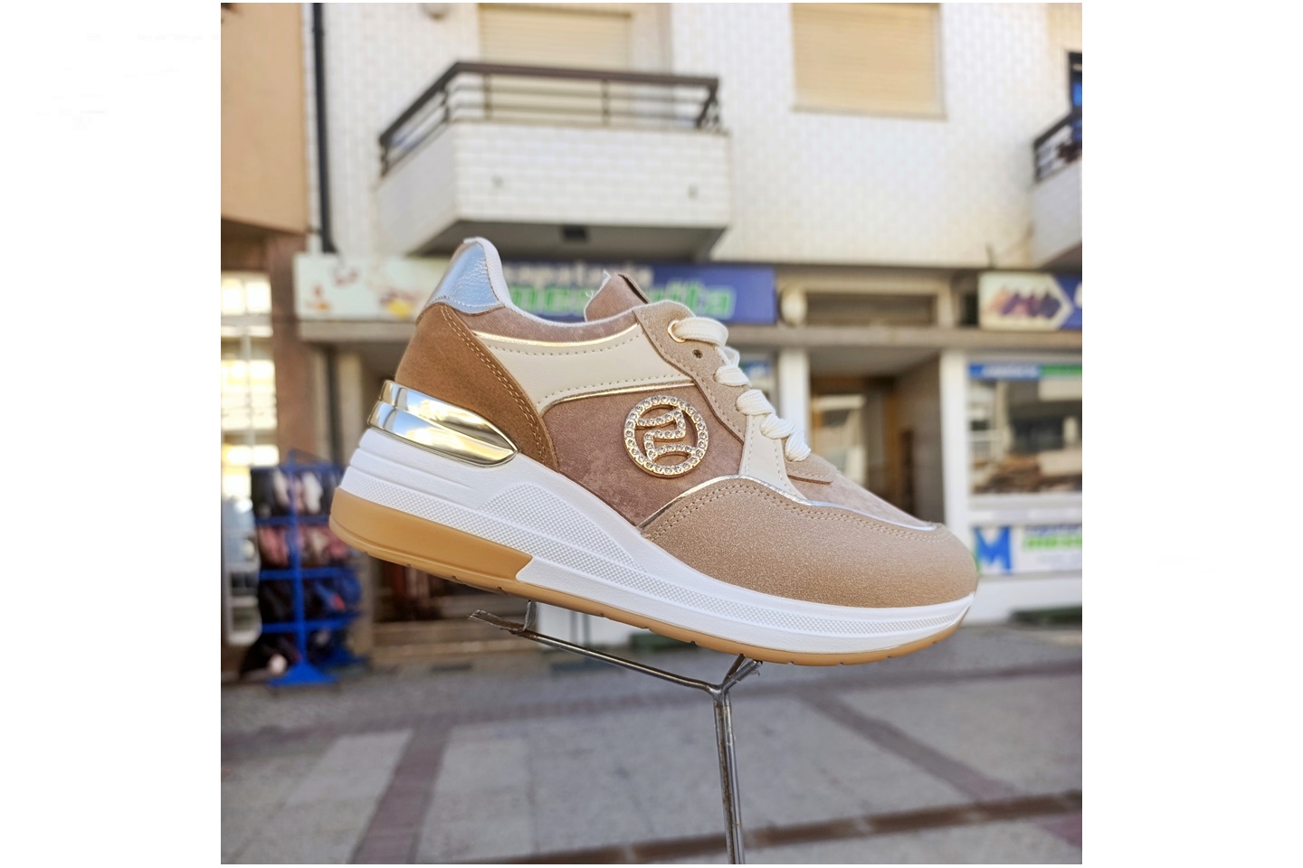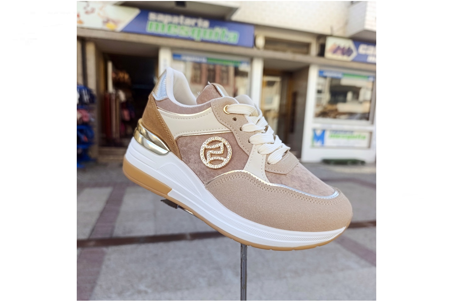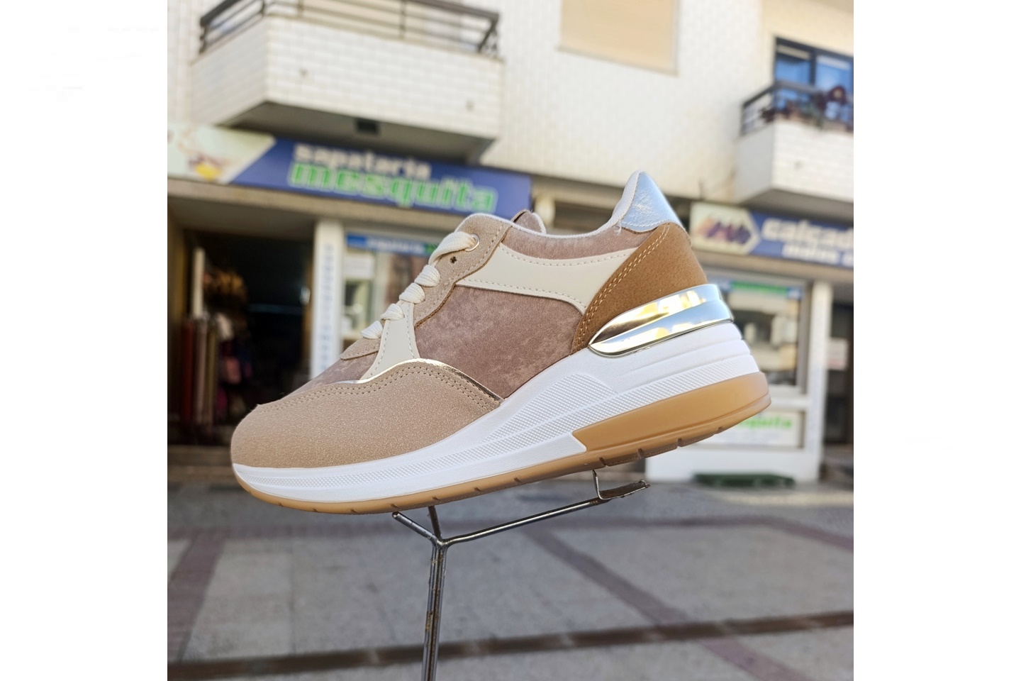 sapatilha de senhora plataforma camel e beje