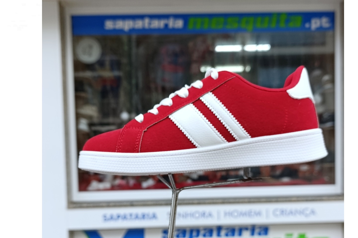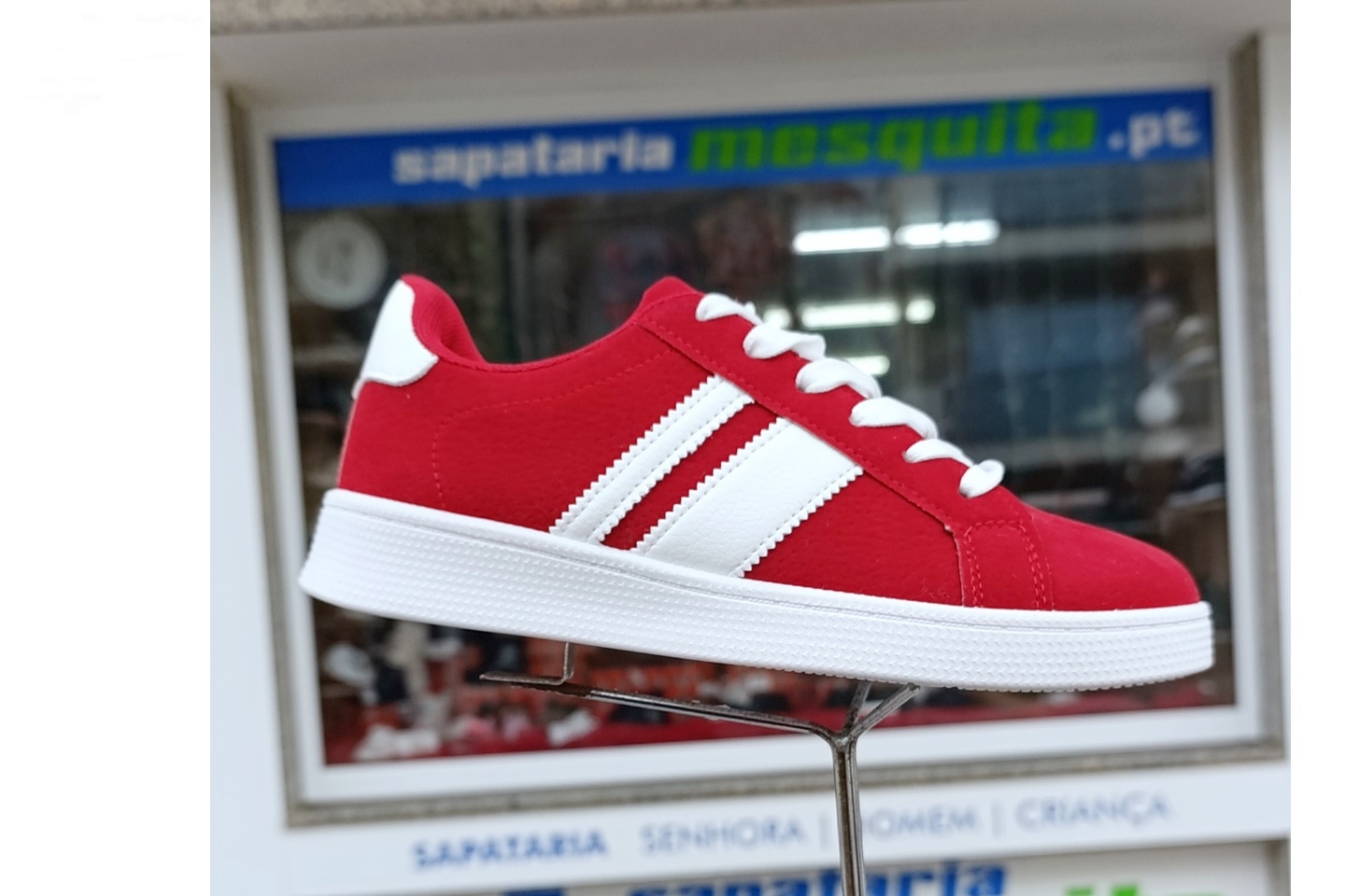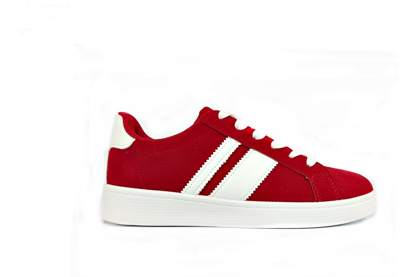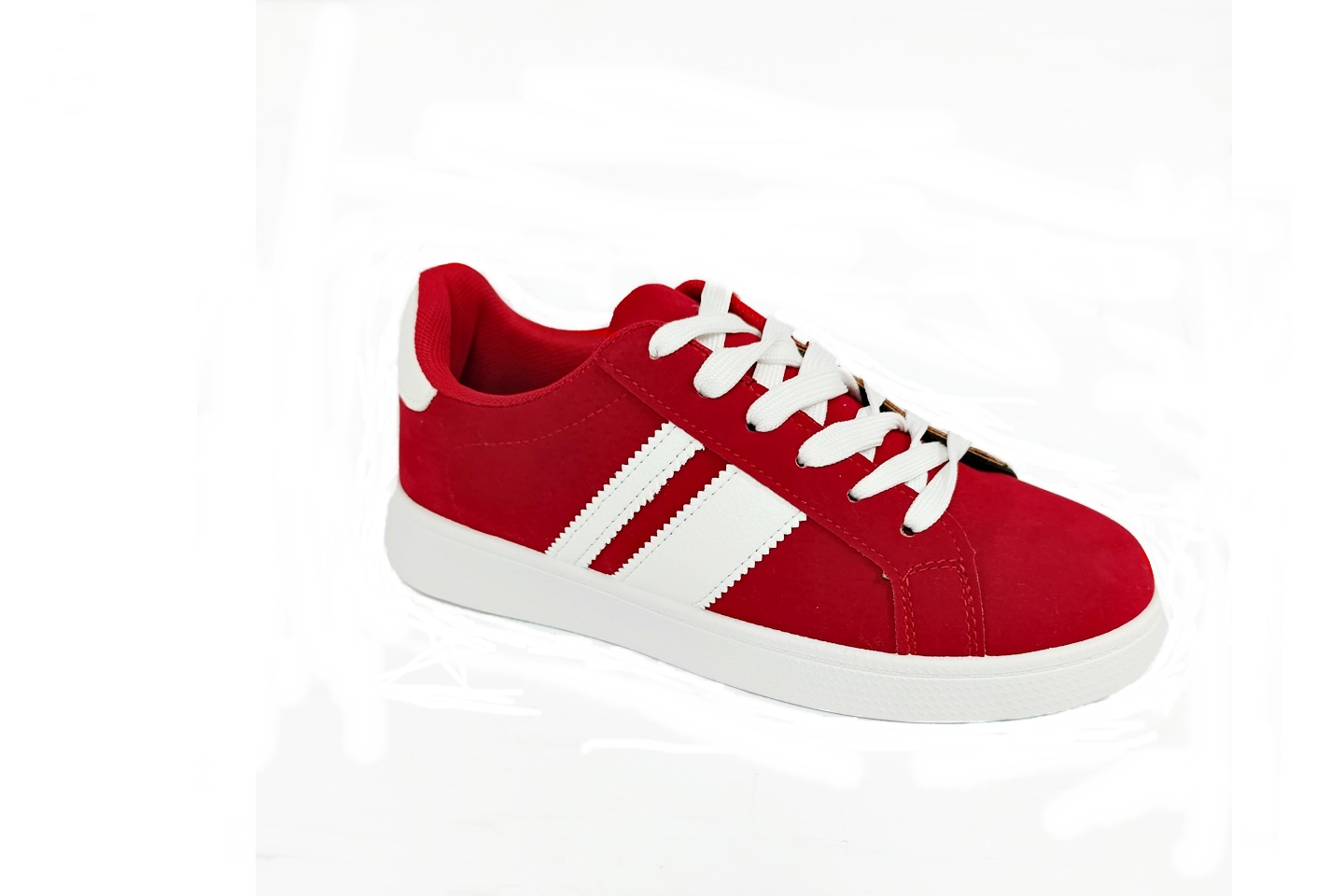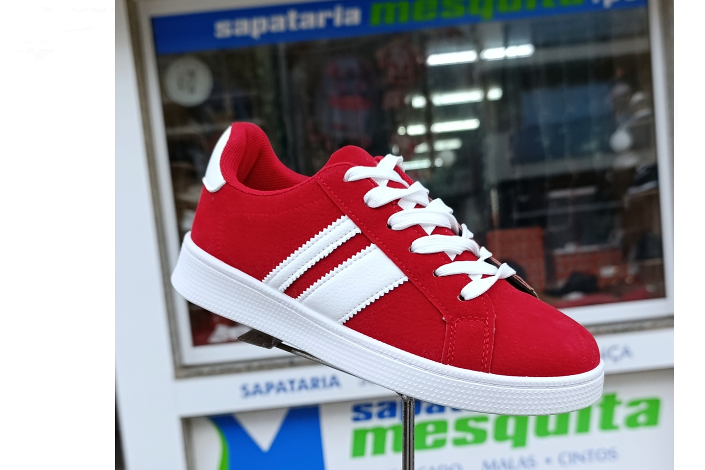 sapatilha vermelha camurça com listas brancas