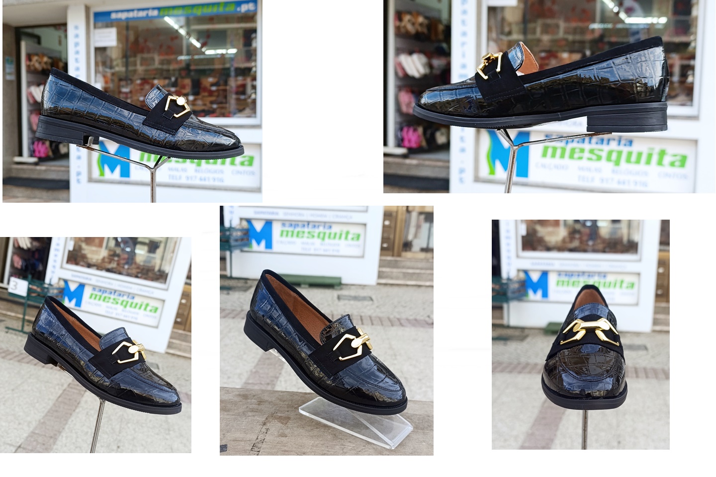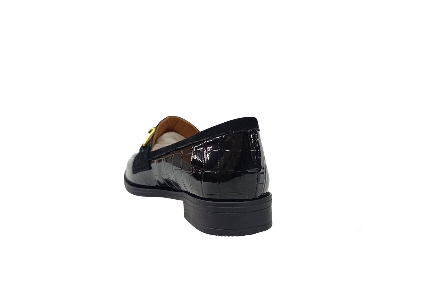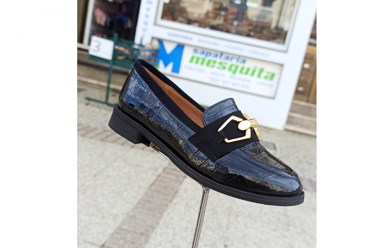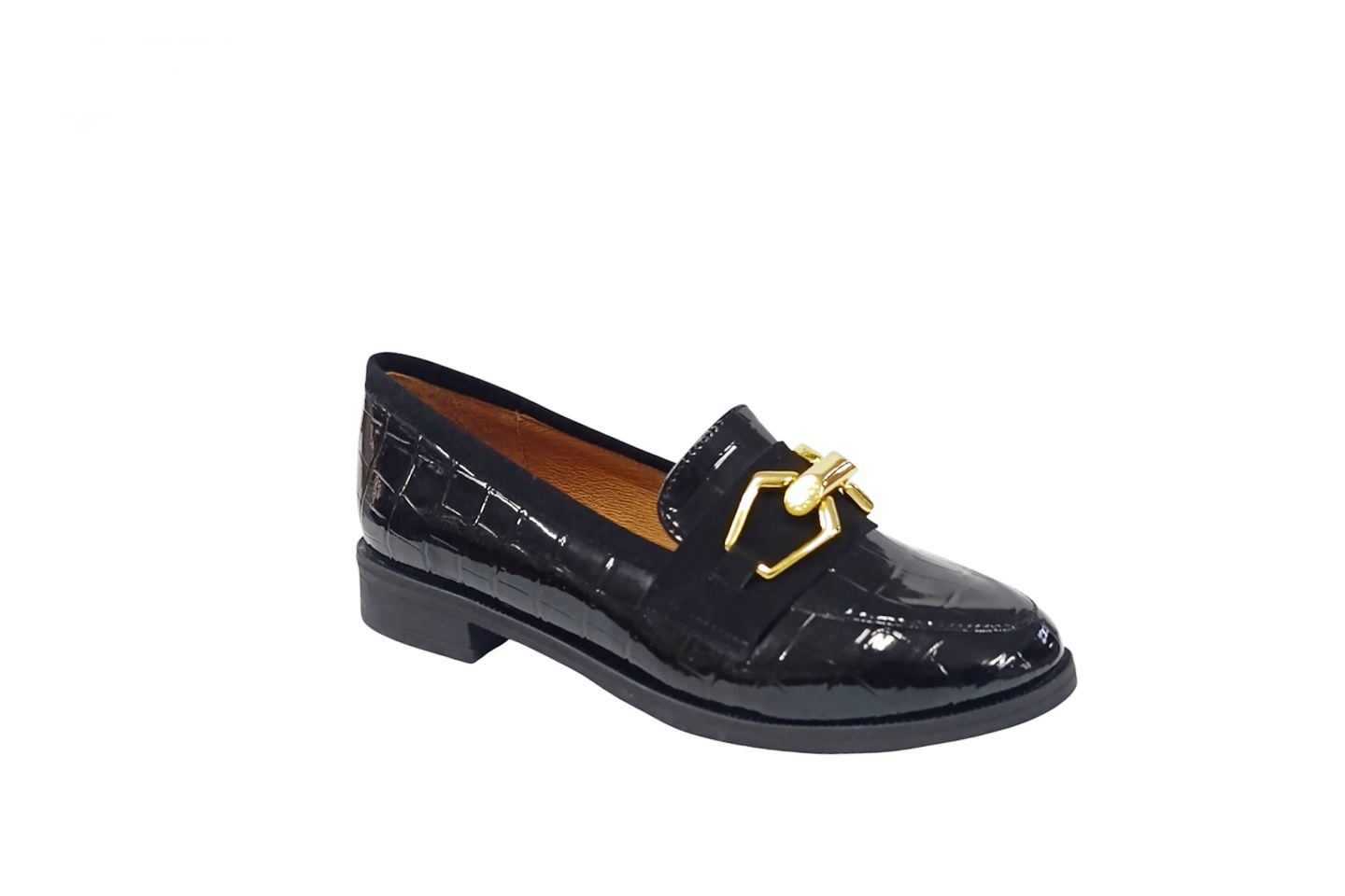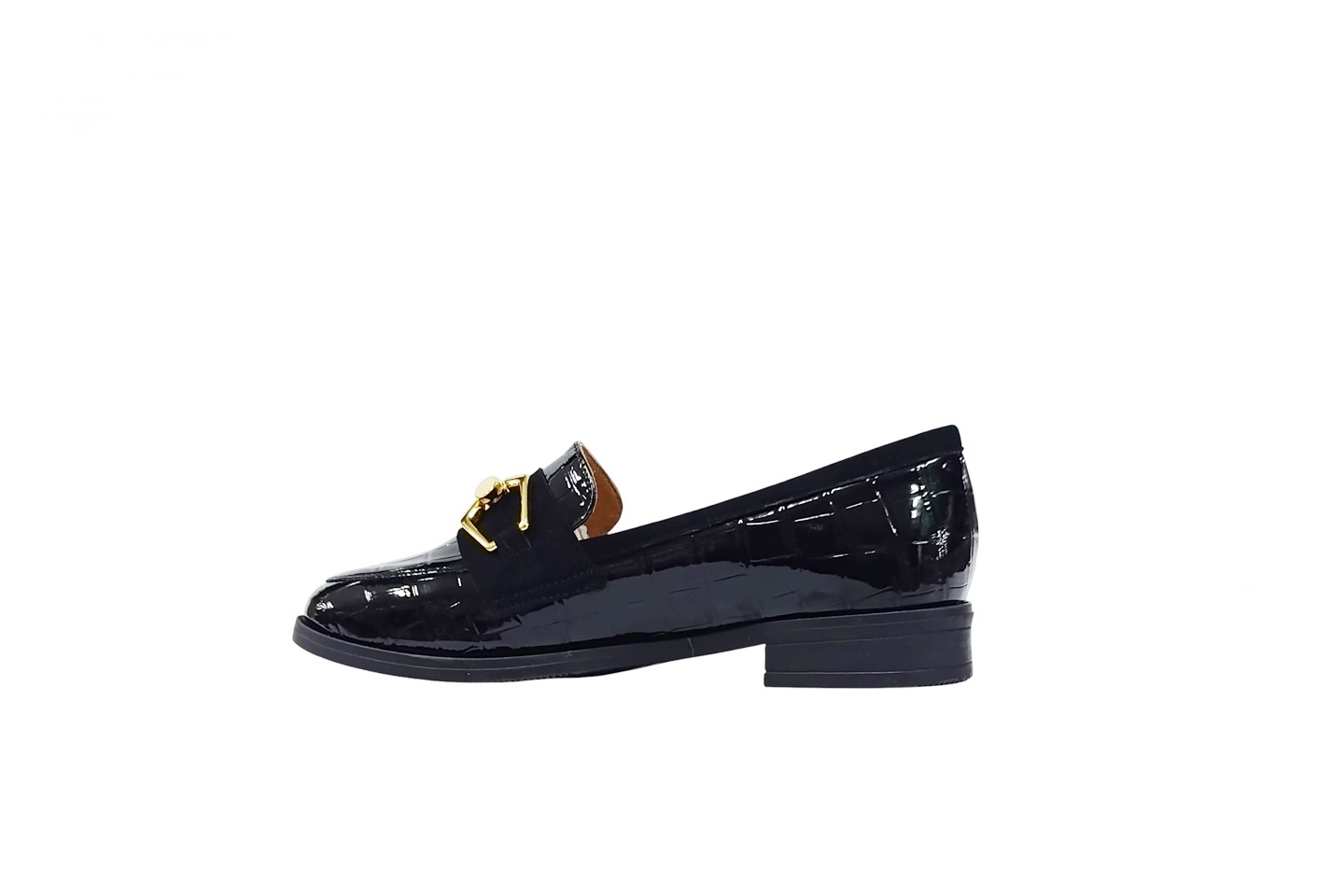 sapato de senhora em pele verniz preta com aplique dourado